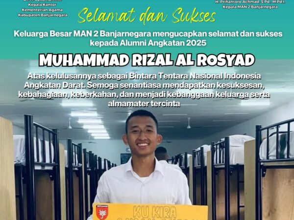 ​Banjarnegara – Keluarga besar MAN 2 Banjarnegara (Mandabara) kembali menorehkan kebanggaan melalui pencapaian salah satu alumni terbaiknya. Muhammad Rizal Al Rosyad, alumni angkatan 2025, secara resmi dinyatakan lulus sebagai Bintara..