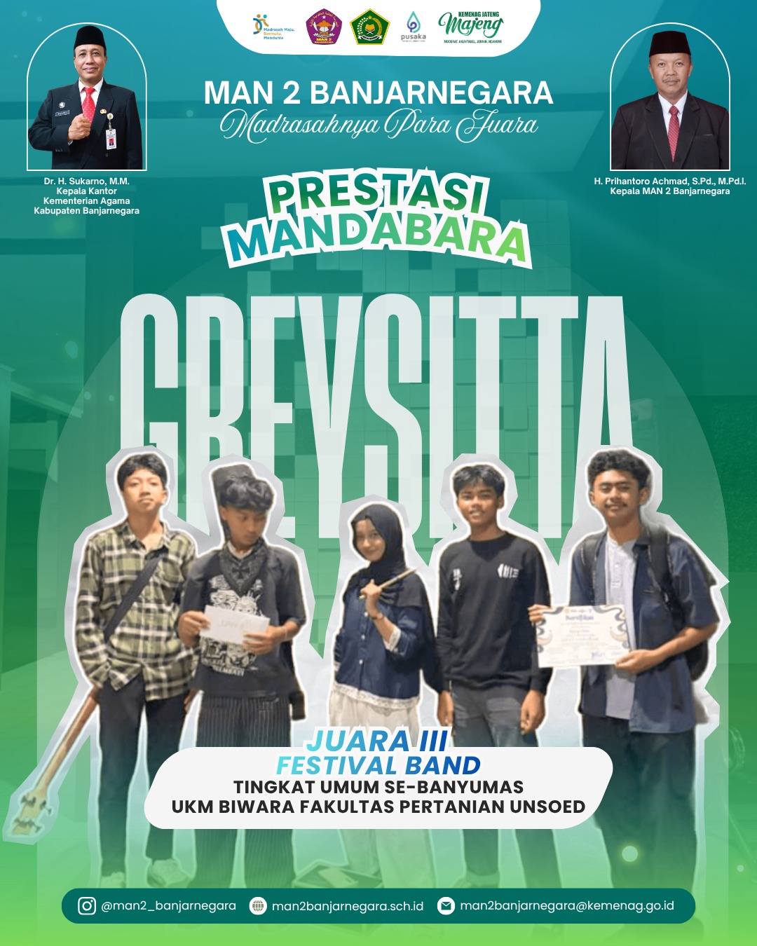 Banjarnegara– Prestasi membanggakan kembali diukir oleh siswa-siswi MAN 2 Banjarnegara atau yang akrab disapa Mandabara, (29/4). Melalui grup musik kebanggaannya, Greysitta Band, Mandabara berhasil meraih Juara III dalam ajang Festival Band Tingkat Umum se-Banyumas Raya. Kompetisi bergengsi ini diselenggarakan oleh Unit Kegiatan Mahasiswa (UKM) BIWARA Fakultas Pertanian Universitas Jenderal Soedirman (Unsoed) Purwokerto.