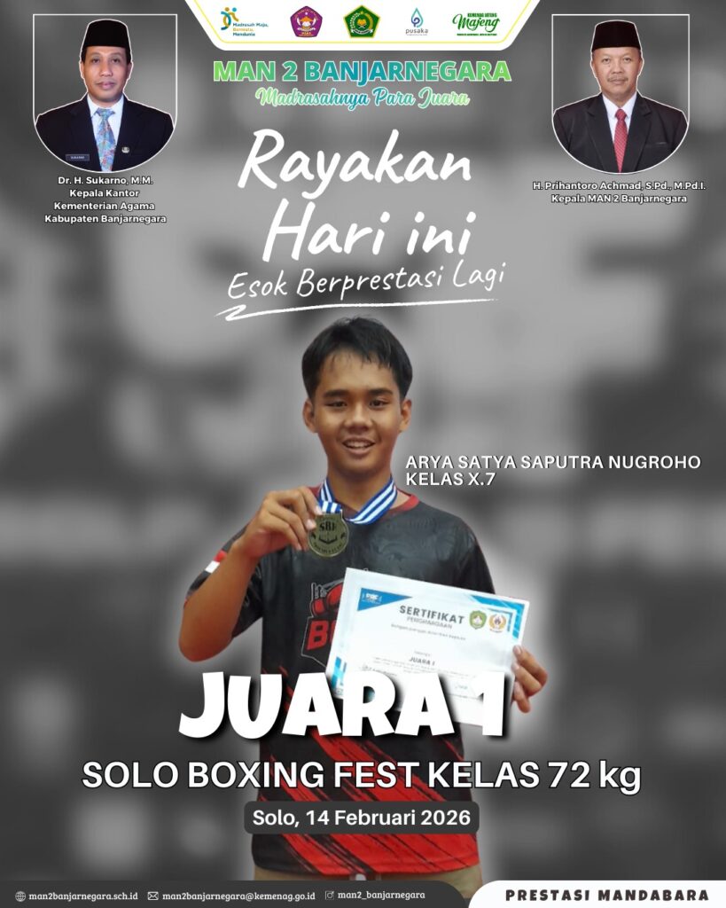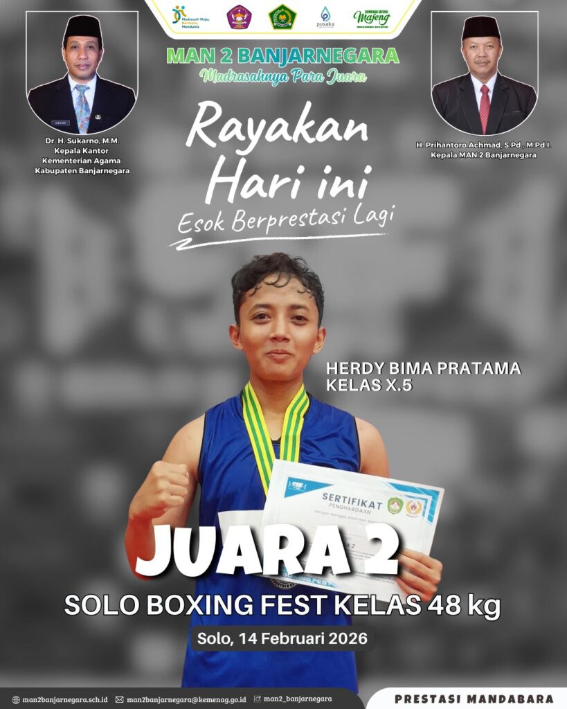 Banjarnegara — Kontingen tinju MAN 2 Banjarnegara (Mandabara) sukses menorehkan prestasi gemilang dalam ajang bergengsi Solo Boxing Fest yang digelar di Kota Surakarta. Dalam kejuaraan yang berlangsung pada14 Februari 2026 tersebut, tiga atlet muda Mandabara berhasil membawa pulang medali emas dan perak setelah menunjukkan performa luar biasa di atas ring.