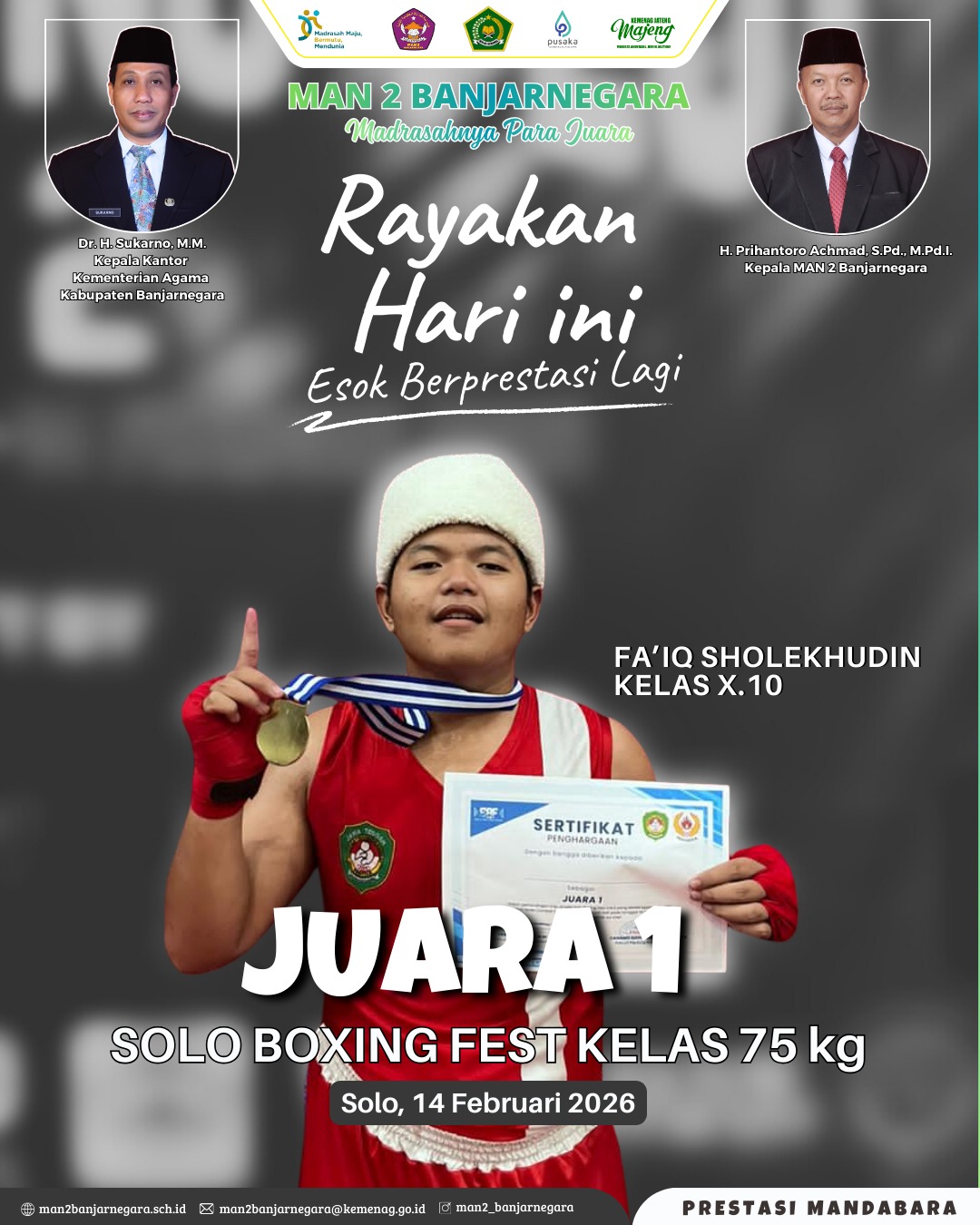 Banjarnegara — Kontingen tinju MAN 2 Banjarnegara (Mandabara) sukses menorehkan prestasi gemilang dalam ajang bergengsi Solo Boxing Fest yang digelar di Kota Surakarta. Dalam kejuaraan yang berlangsung pada14 Februari 2026 tersebut, tiga atlet muda Mandabara berhasil membawa pulang medali emas dan perak setelah menunjukkan performa luar biasa di atas ring.