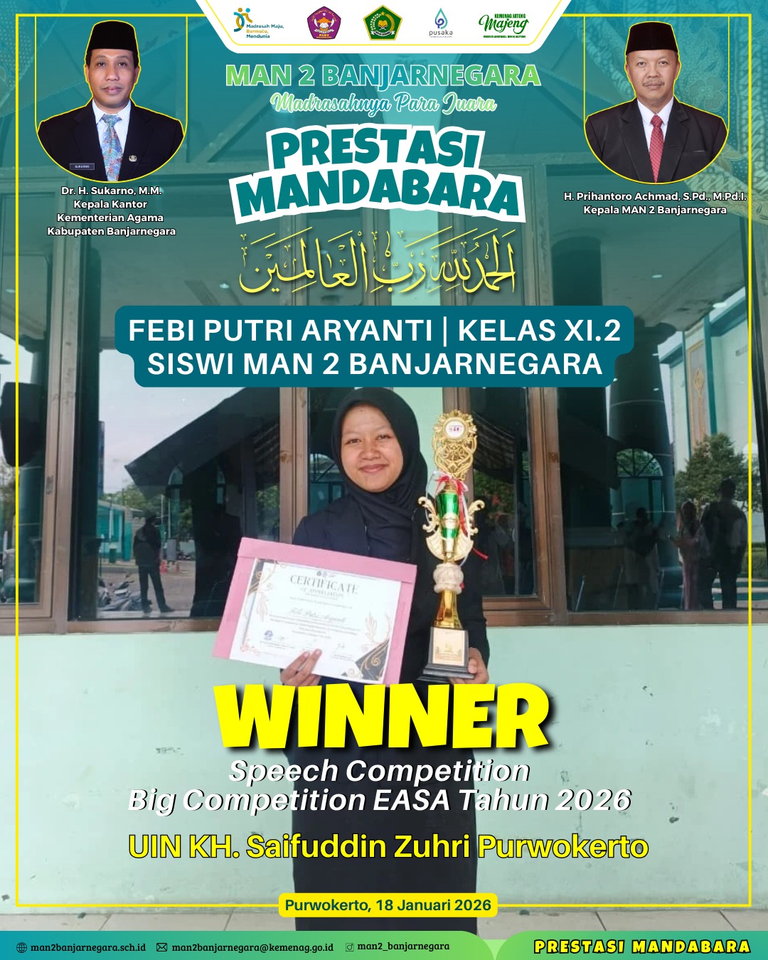 Banjarnegara – Prestasi membanggakan kembali ditorehkan oleh siswa Madrasah Aliyah Negeri (MAN) 2 Banjarnegara atau Mandabara dalam ajang kompetisi tingkat regional, (19/1). Kali ini, Febi Putri Aryanti, siswi kelas XI.2, berhasil menyabet gelar juara 1 dalam kategori Speech Competition pada gelaran “Big Competition EASA Tahun 2026” yang diselenggarakan di Kampus UIN KH. Saifuddin Zuhri, Purwokerto, pada Sabtu 17 Januari 2026.