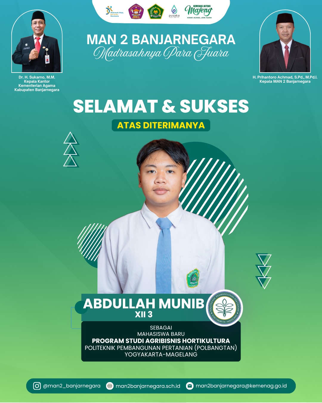 Banjarnegara – Kabar membanggakan kembali menyelimuti keluarga besar MAN 2 Banjarnegara atau yang akrab disapa Mandabara. Salah satu siswa terbaiknya dari kelas XII 3, Abdullah Munib, dinyatakan lolos seleksi dan resmi diterima sebagai mahasiswa baru di Politeknik Pembangunan Pertanian (Polbangtan) Yogyakarta-Magelang, (25/4). Pengumuman keberhasilan ini diterima pada akhir April 2026 dan menjadi capaian prestisius bagi madrasah.