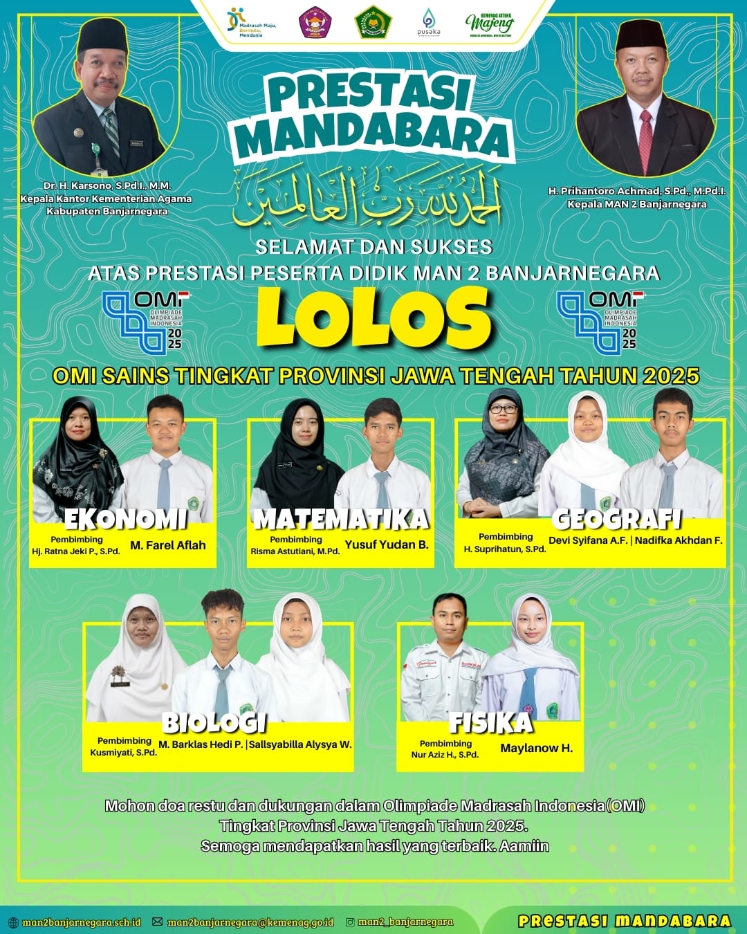 Banjarnegara – Tujuh siswa Madrasah Aliyah Negeri 2 Banjarnegara atau Mandabara berhasil menorehkan prestasi gemilang dengan lolos seleksi Olimpiade Madrasah Indonesia (OMI) bidang sains tingkat Kabupaten Banjarnegara (17/9). Seleksi yang diselenggarakan secara daring ini merupakan babak awal menuju OMI tingkat provinsi dan nasional.